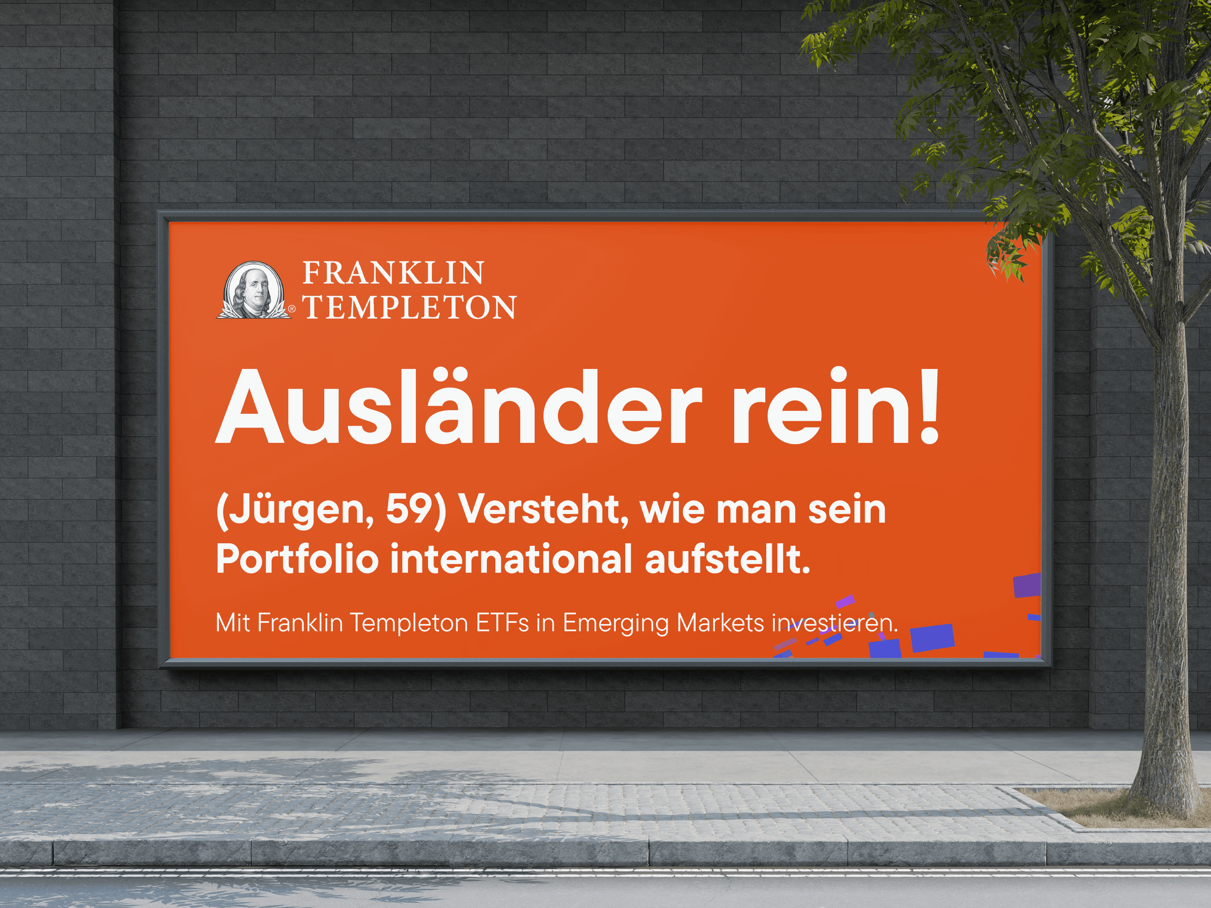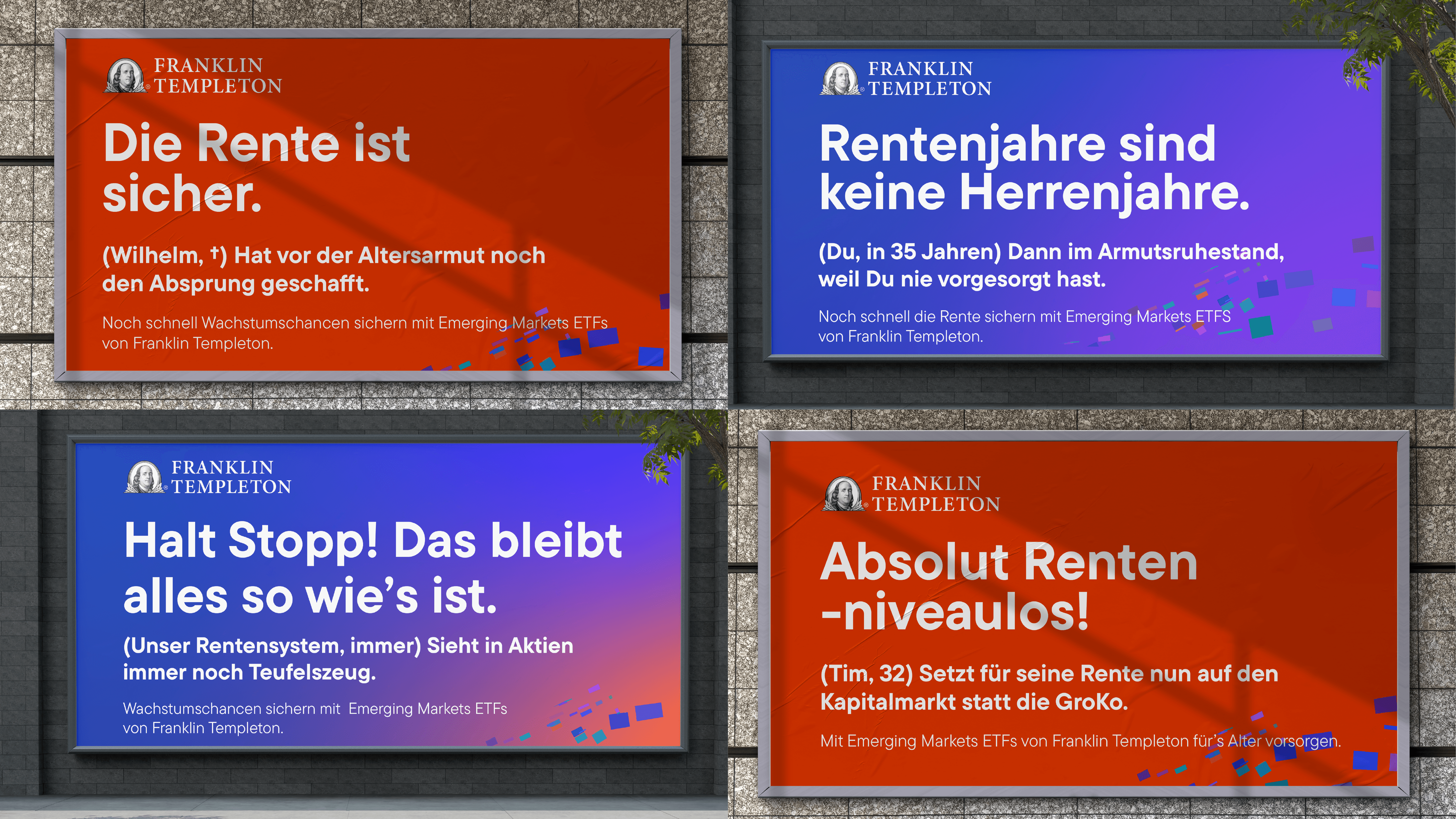 Für die ETFs von Franklin Templeton haben wir eine Werbe-Kampagne erstellt, die auch dem letzten Sparkassen-Berater zeigt, wie man richtig anlegt. Ziel der Kampagne war es, Verbraucher beim Vermögensaufbau zu unterstützen und ihnen eine Alternative in der Altersvorsorge an die Hand zu geben. Damit nicht nur unser Kunde, sondern auch dessen Kunden richtig Geld scheffeln und später nicht Dauergast am Pfandflaschen-Automat sind. Mit Display-Ads und Plakaten, Werbespot und Landingpage haben wir den DACH-Raum mit bester Unterhaltung versorgt und mit verstaubten Klichees aus der Finanzbranche aufgeräumt.